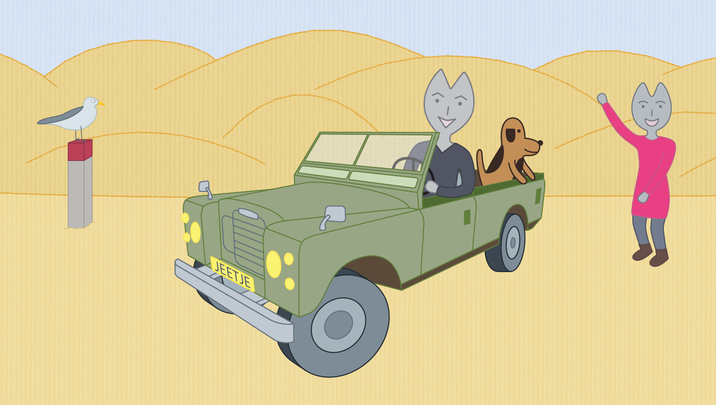Jeetje, de goede vriend van Kaatje en Mup heet hun altijd welkom op het strand. Jeetje is een ware kenner van de zee en de omgeving. Met zijn stoere jeep en zijn eindeloze verhalen over het strand en de zee, maakt hij elk uitje nog avontuurlijker.